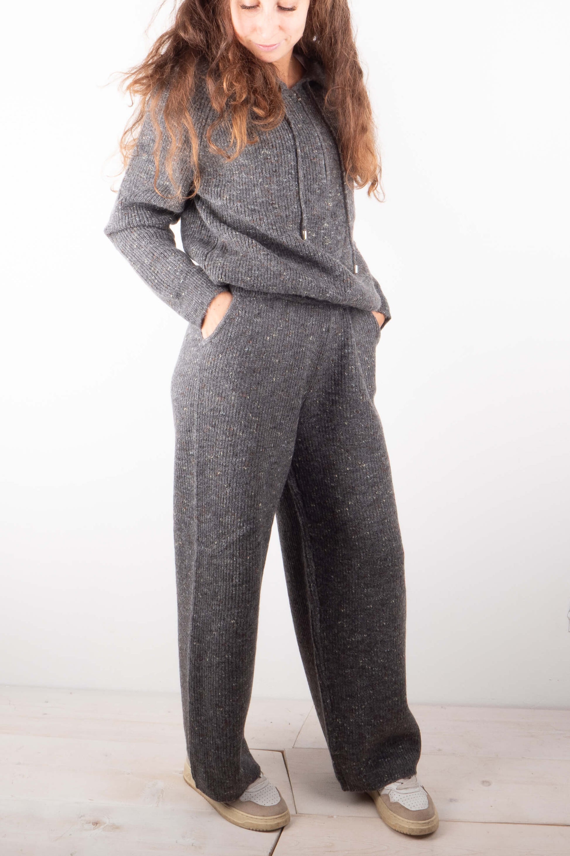 Comfort e stile si incontrano in questo completo coordinato, perfetto per un look casual ma ricercato. Realizzato in morbida lana mélange, presenta una texture a costine con piccoli punti colorati che donano movimento e originalità al tessuto.