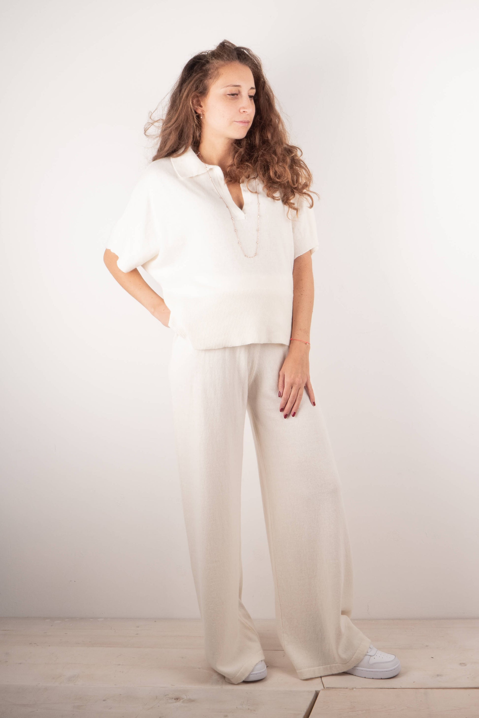 La polo con scollo a V valorizza il décolleté con discrezione e dona un tocco di femminilità sofisticata, mentre il pantalone morbido a palazzo scivola con eleganza sulla figura, assicurando una vestibilità fluida e armoniosa. Perfetto anche completato da un cardigan lungo tono su tono.