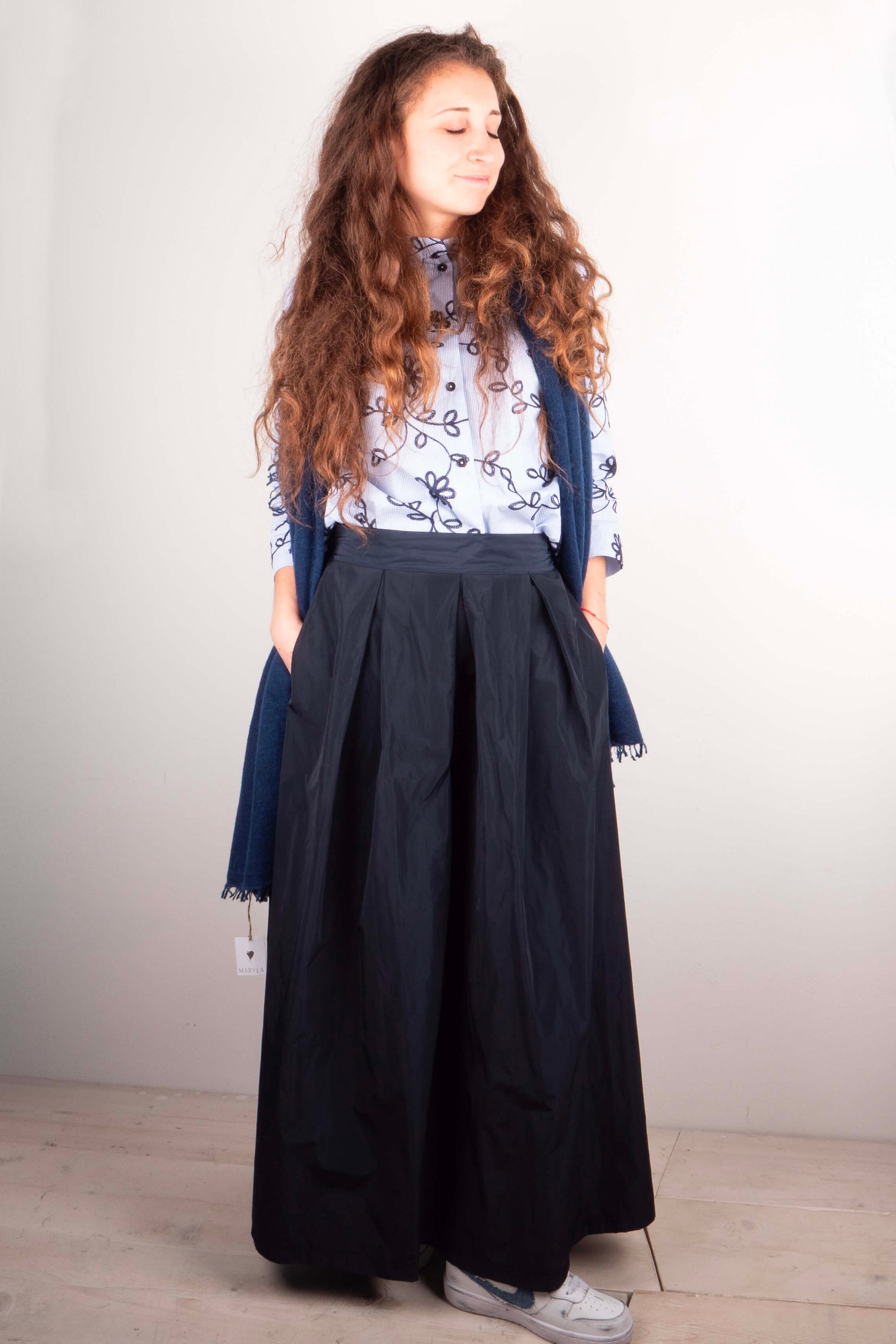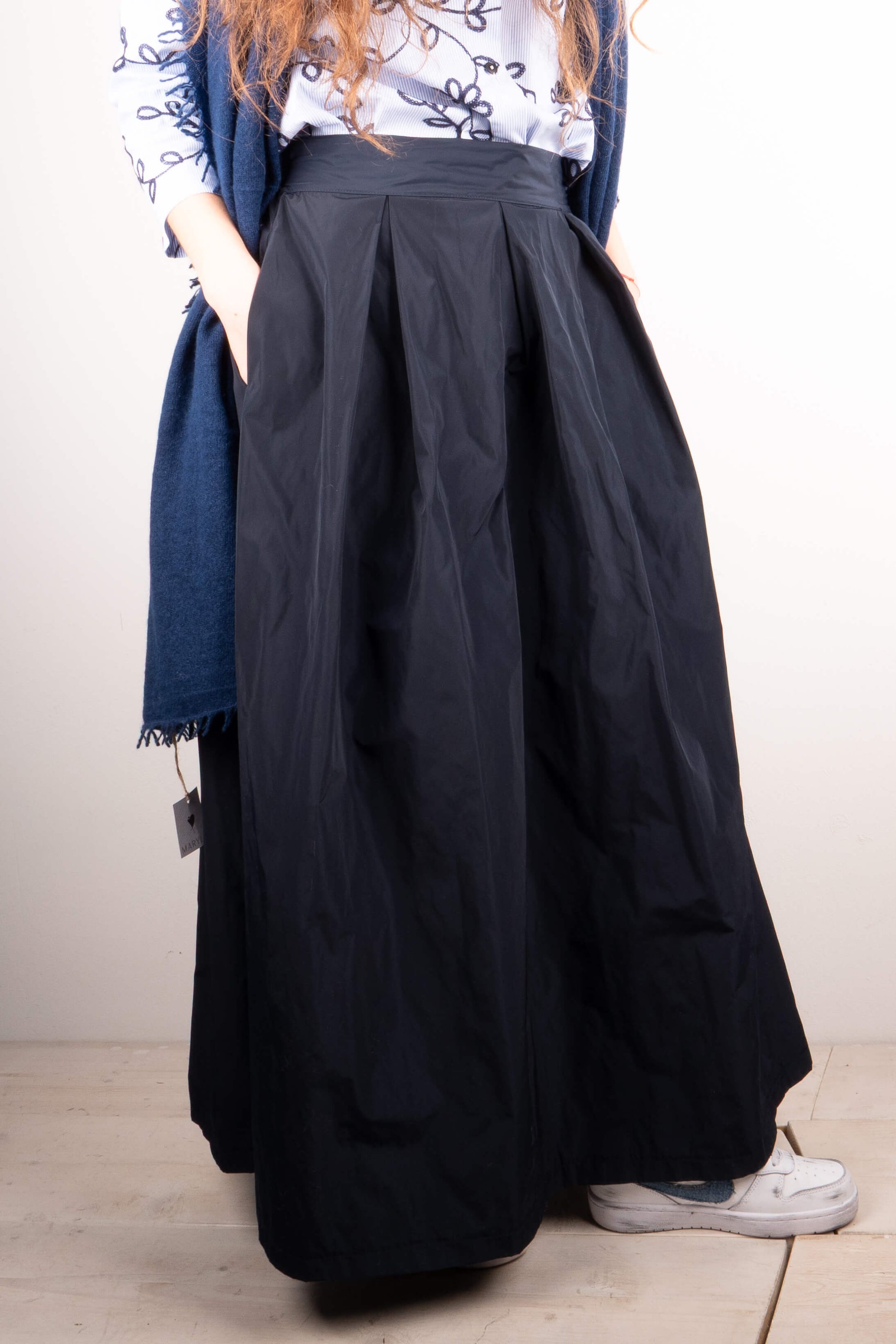 Gonna a pieghe in taffetà blu con elastico in vita